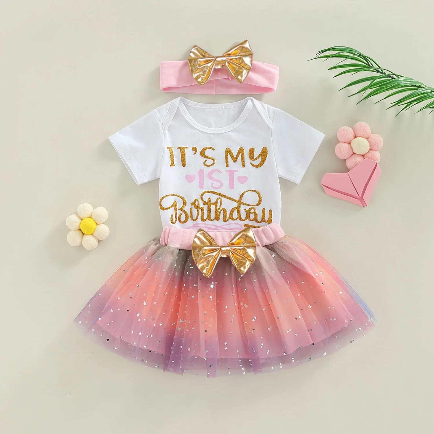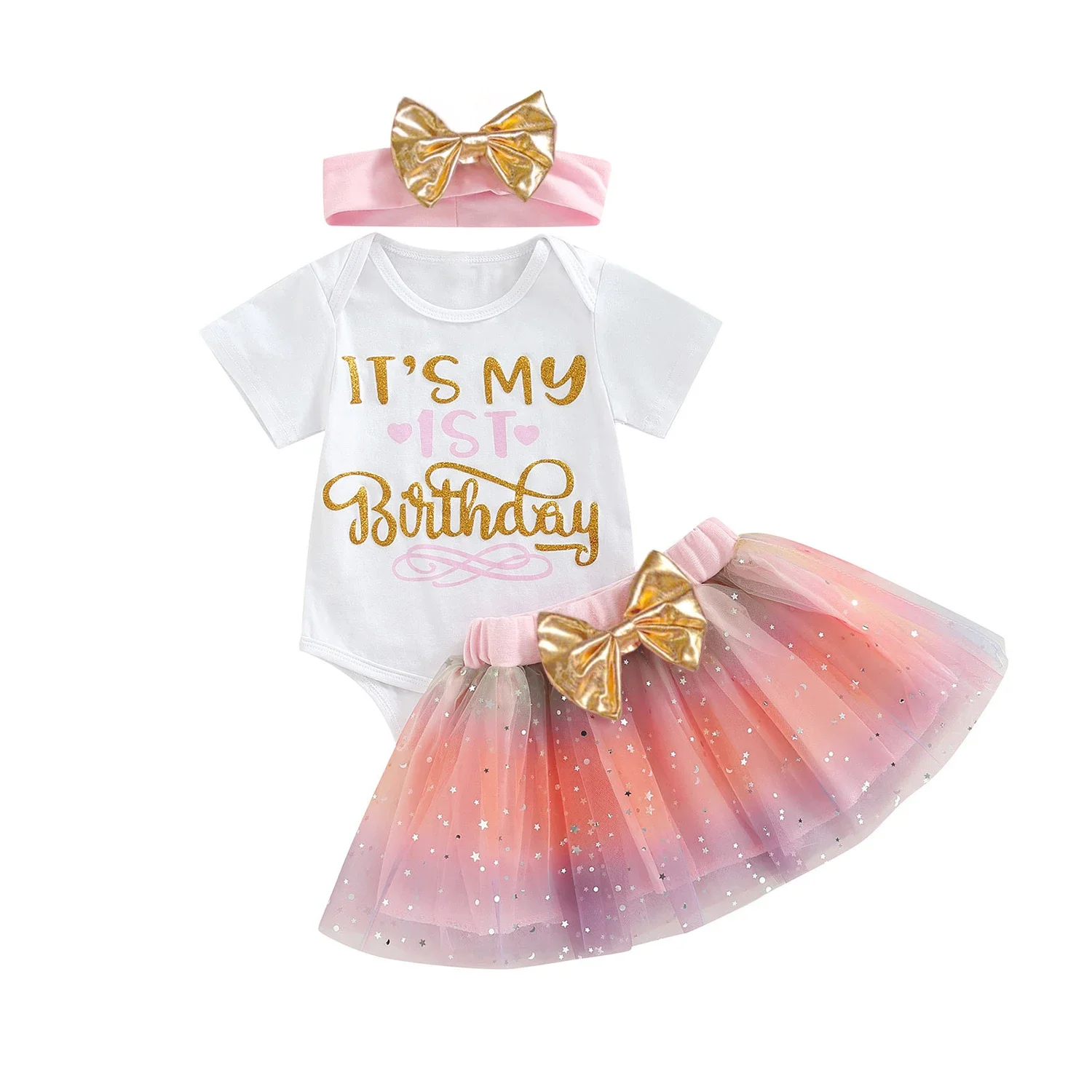 Adorable baby girl 1st birthday outfit with “It’s My First Birthday” romper, matching skirt & hairband. Perfect for birthday photos & parties!